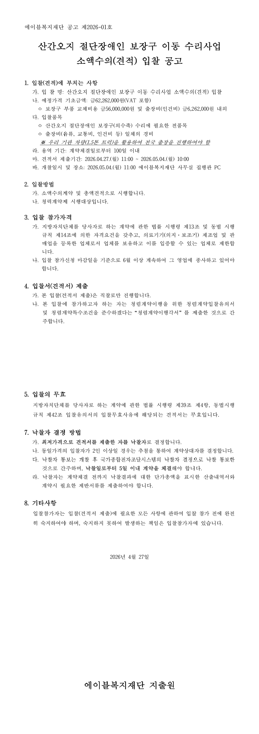 산간오지 절단장애인 보장구 이동 수리사업 소액수의(견적) 입찰 공고 |