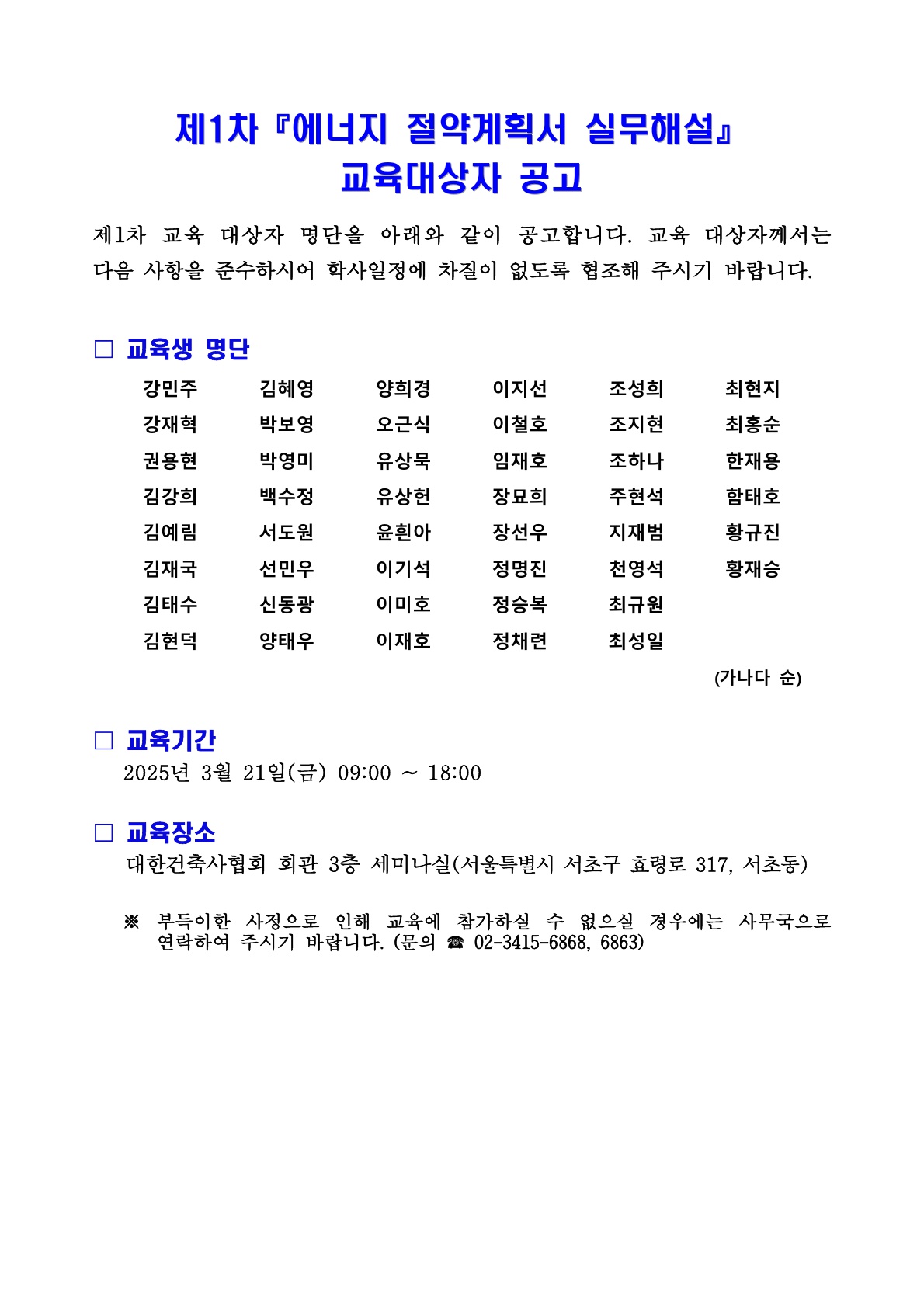제1차『에너지 절약계획서 실무해설』 교육대상자 공고