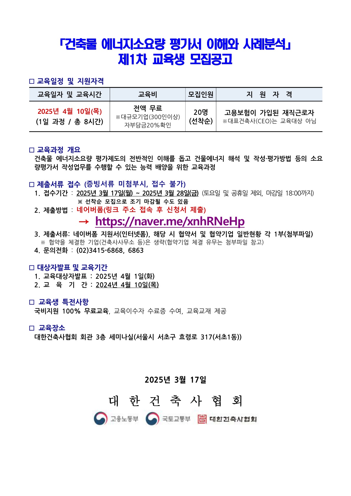 「건축물 에너지소요량 평가서 이해와 사례분석」 제1차 교육생 모집공고