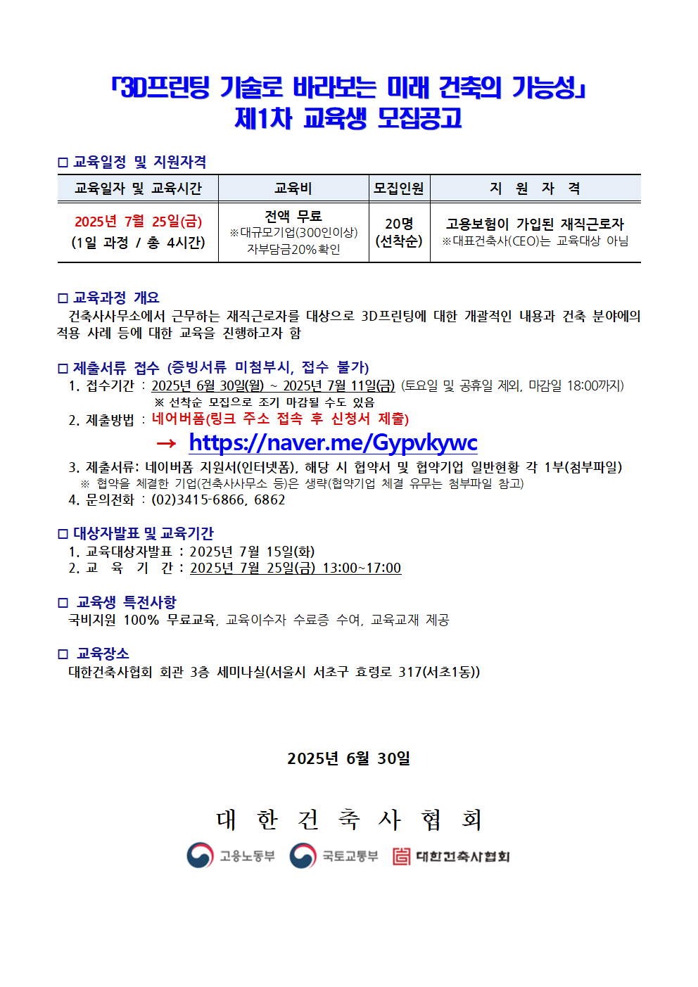 제1차『3D 프린팅 기술로 바라보는 미래 건축의 가능성』 교육생 모집공고