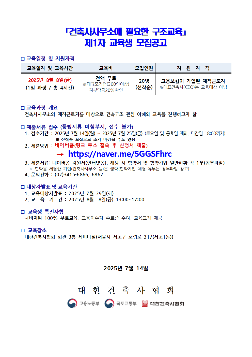 제1차『건축사사무소에 필요한 구조교육』 교육생 모집공고