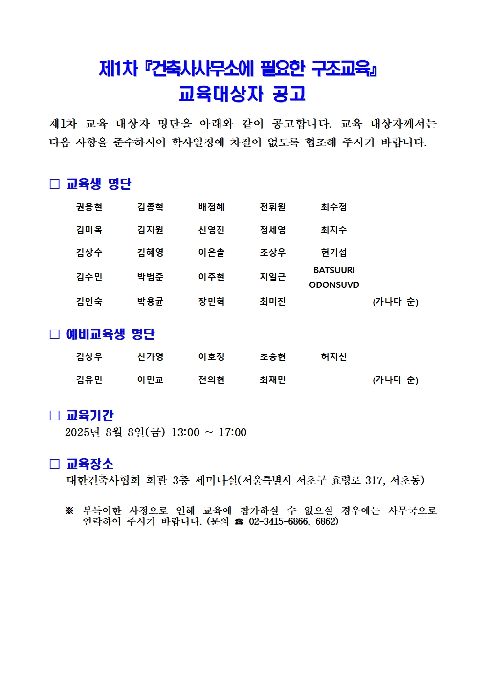 제1차『건축사사무소에 필요한 구조교육』교육대상자 공고