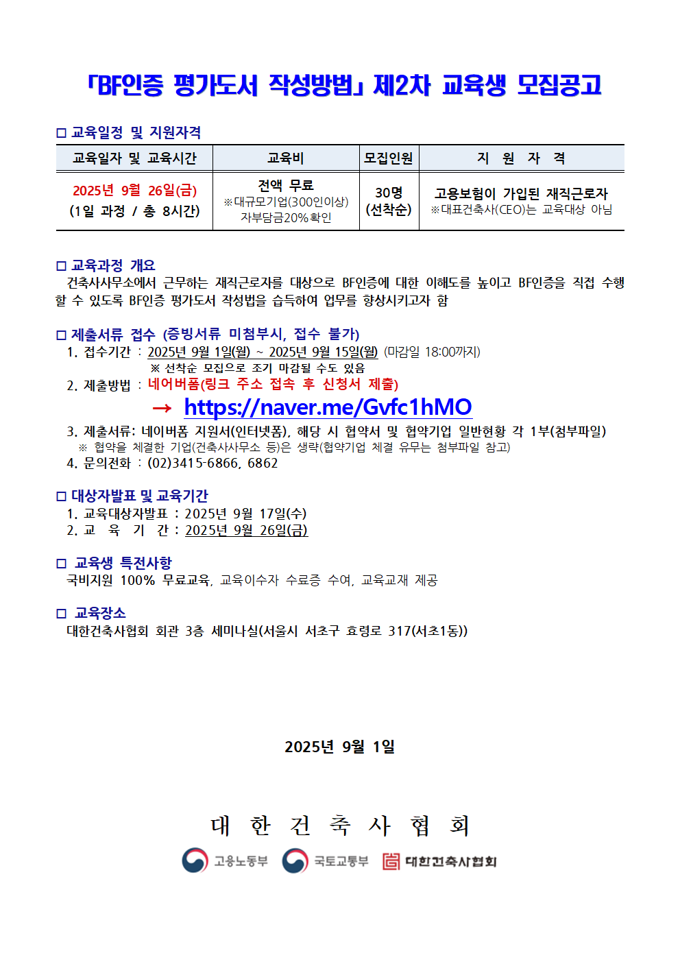 제2차「BF인증 평가도서 작성방법」교육생 모집공고