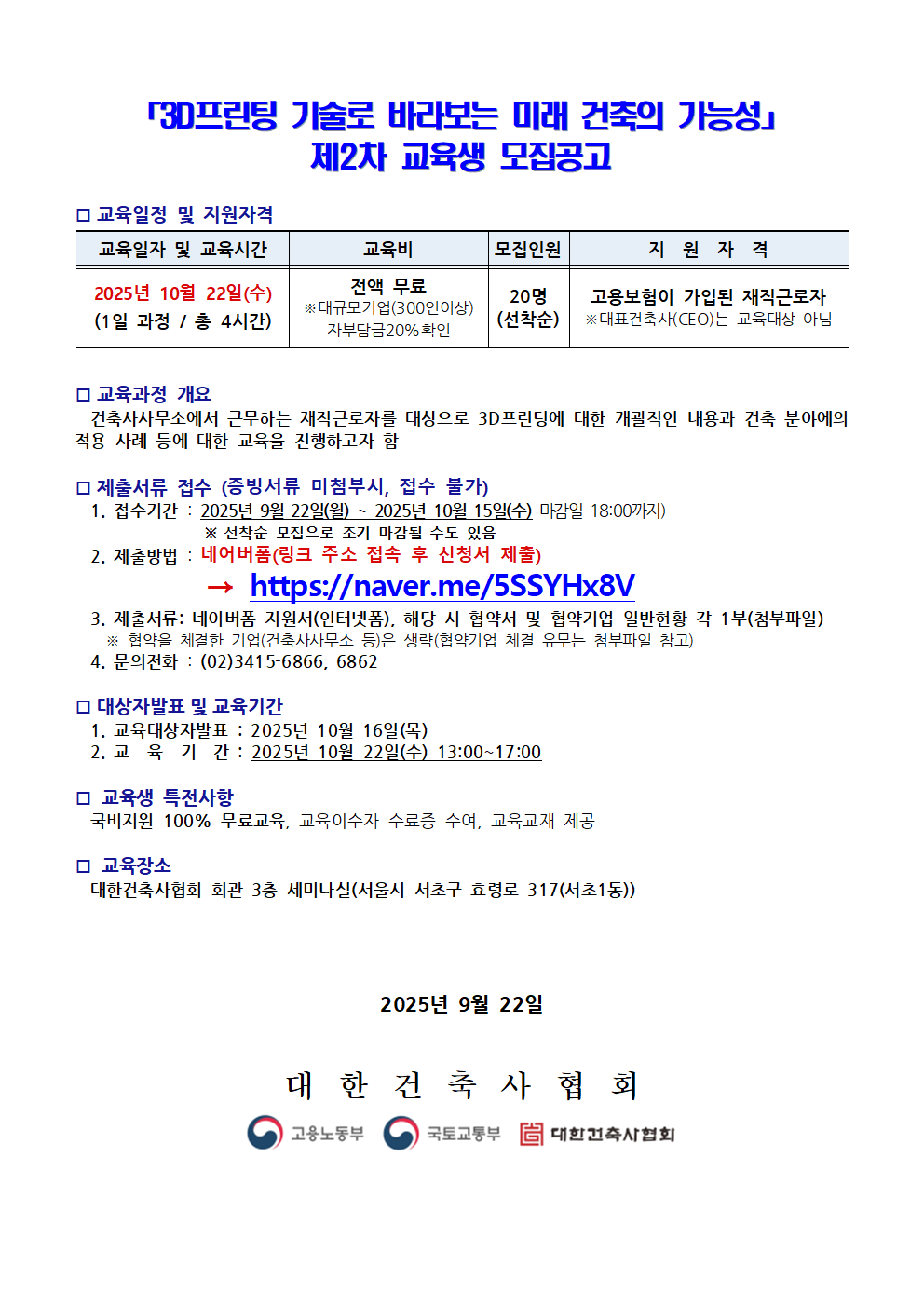 제2차『3D 프린팅 기술로 바라보는 미래 건축의 가능성』 교육생 모집공고