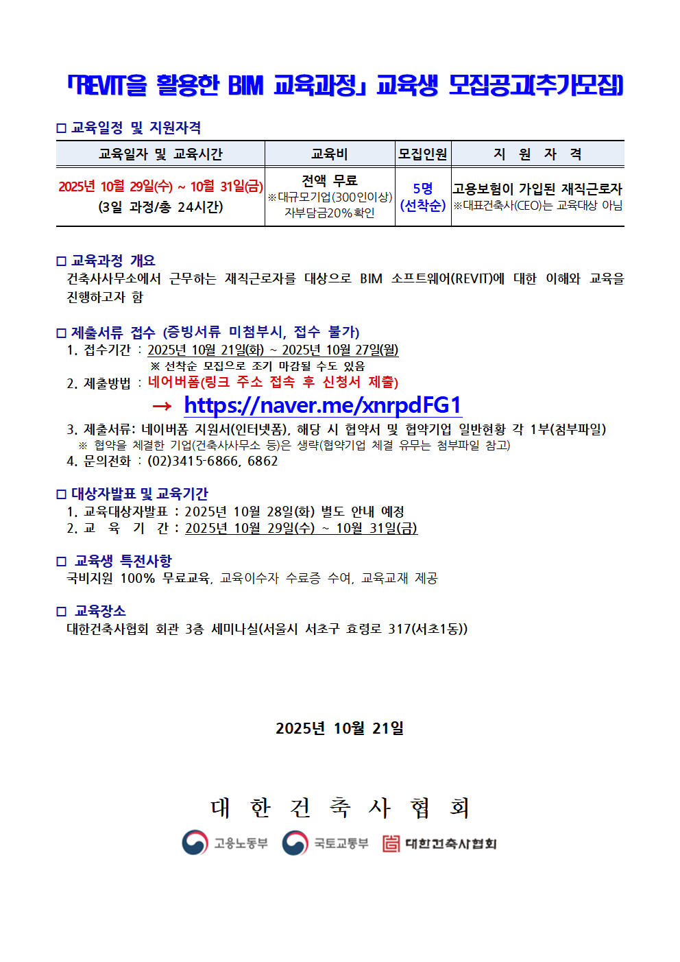 『REVIT을 활용한 BIM교육과정』 교육생 모집공고(추가모집)