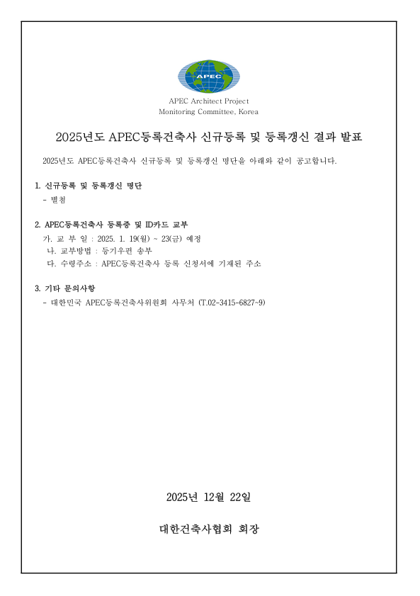 2025년도 하반기 APEC등록건축사 신규등록 및 등록갱신 결과 발표