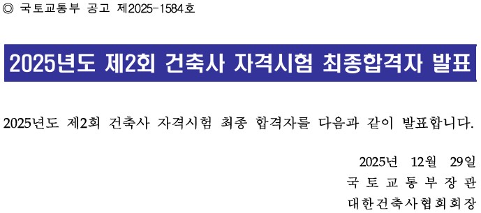 2025년도 제2회 건축사 자격시험 최종합격자 발표
