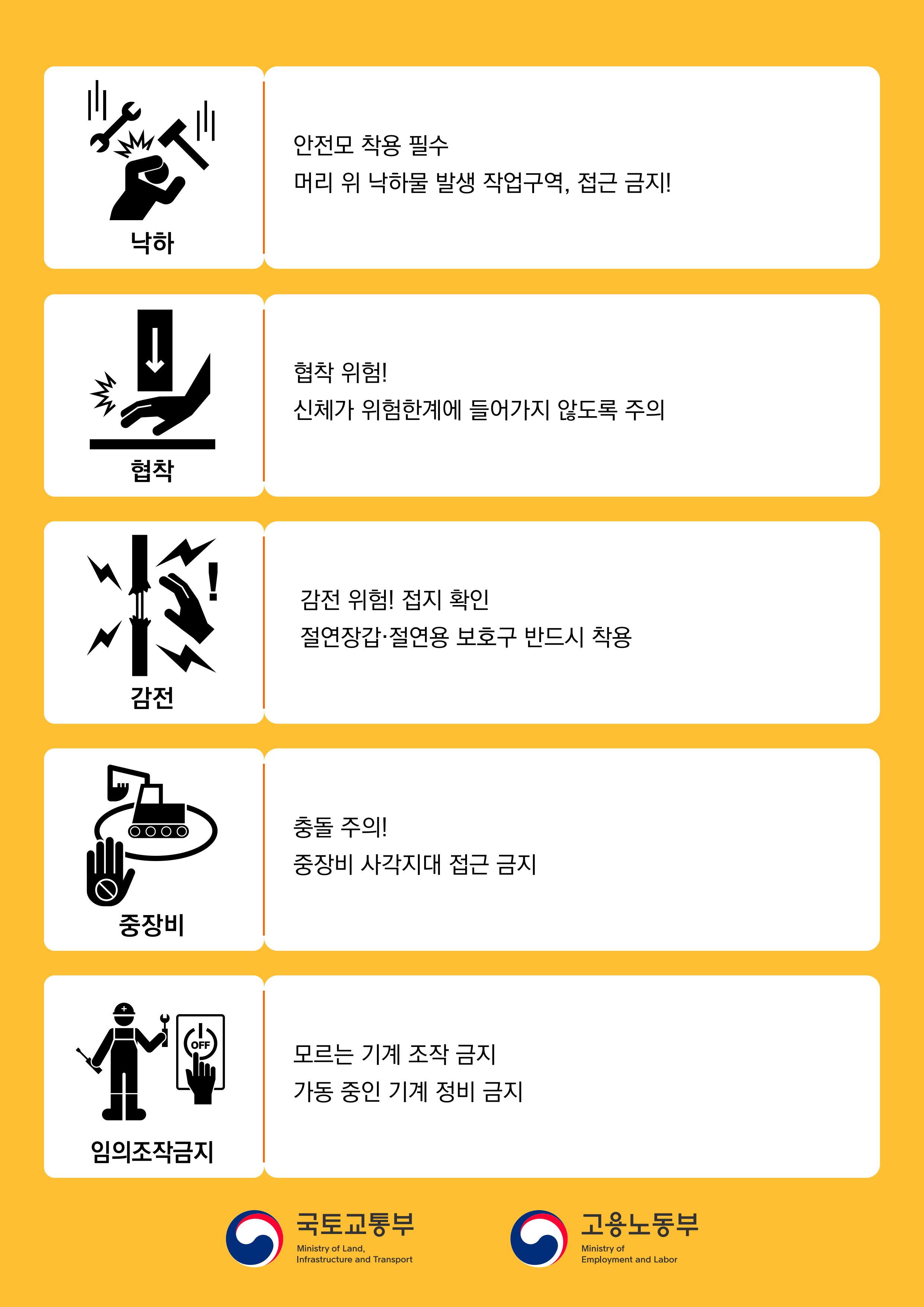 국토교통부와 고용노동부는 건설현장 외국인근로자의 산업재해 예방과 안전문화 확산을 위해 다국어(한국어 및 10개 외국어)* 안전표지(픽토그램 및 안전수칙 10조)**를 제작하였습니다.