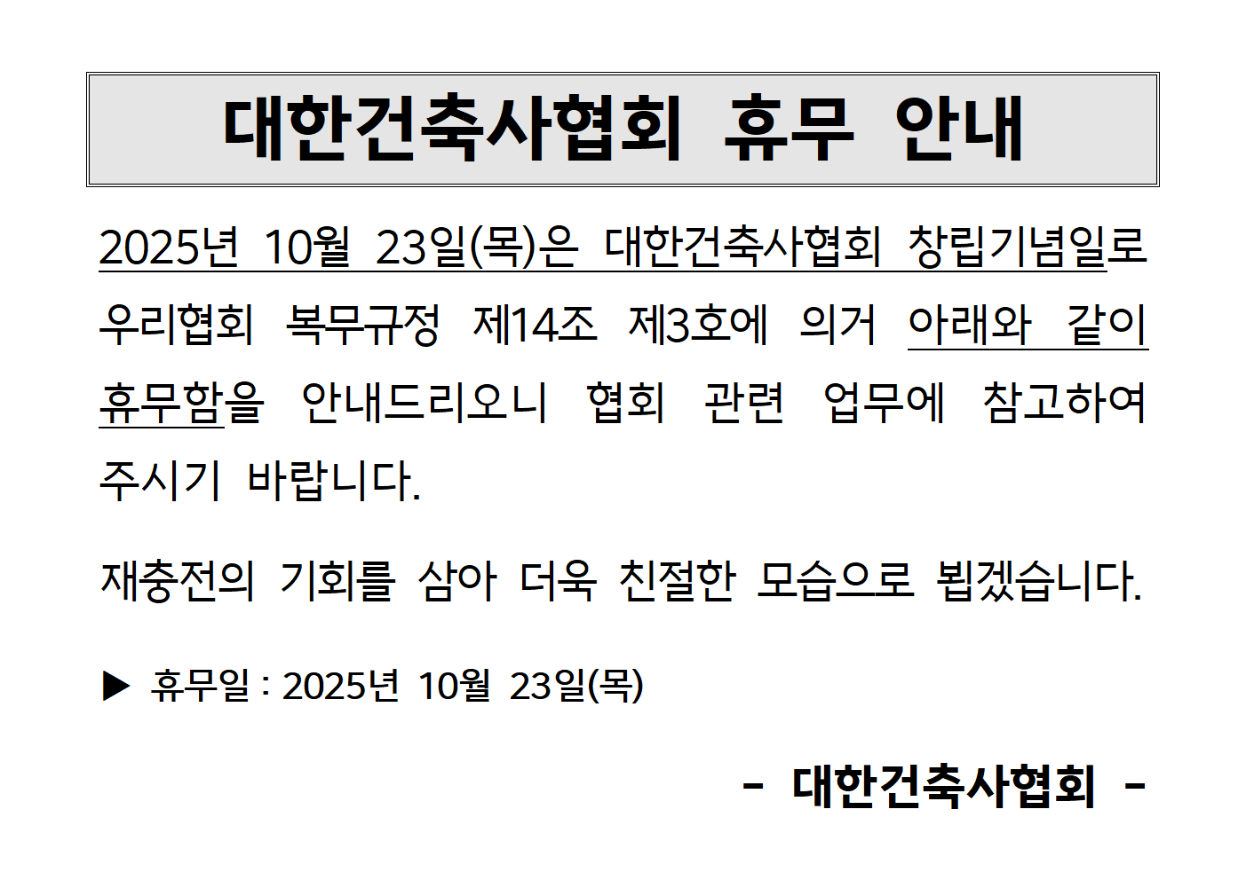 협회 창립기념일 휴무안내 ('25.10.23.)