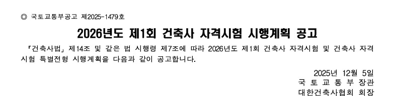 2026년도 제1회 건축사 자격시험 시행계획 공고