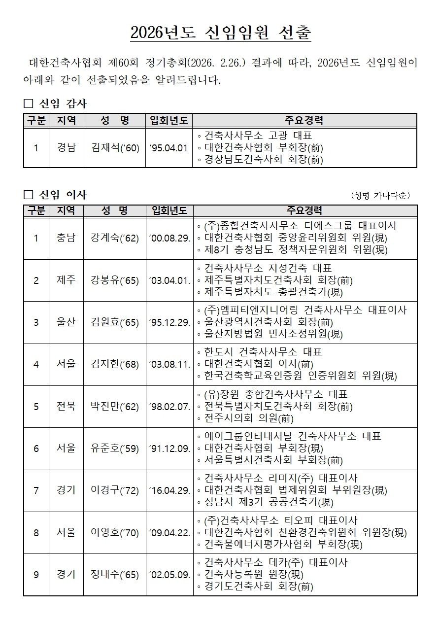 대한건축사협회 2026년도 신임임원 선출