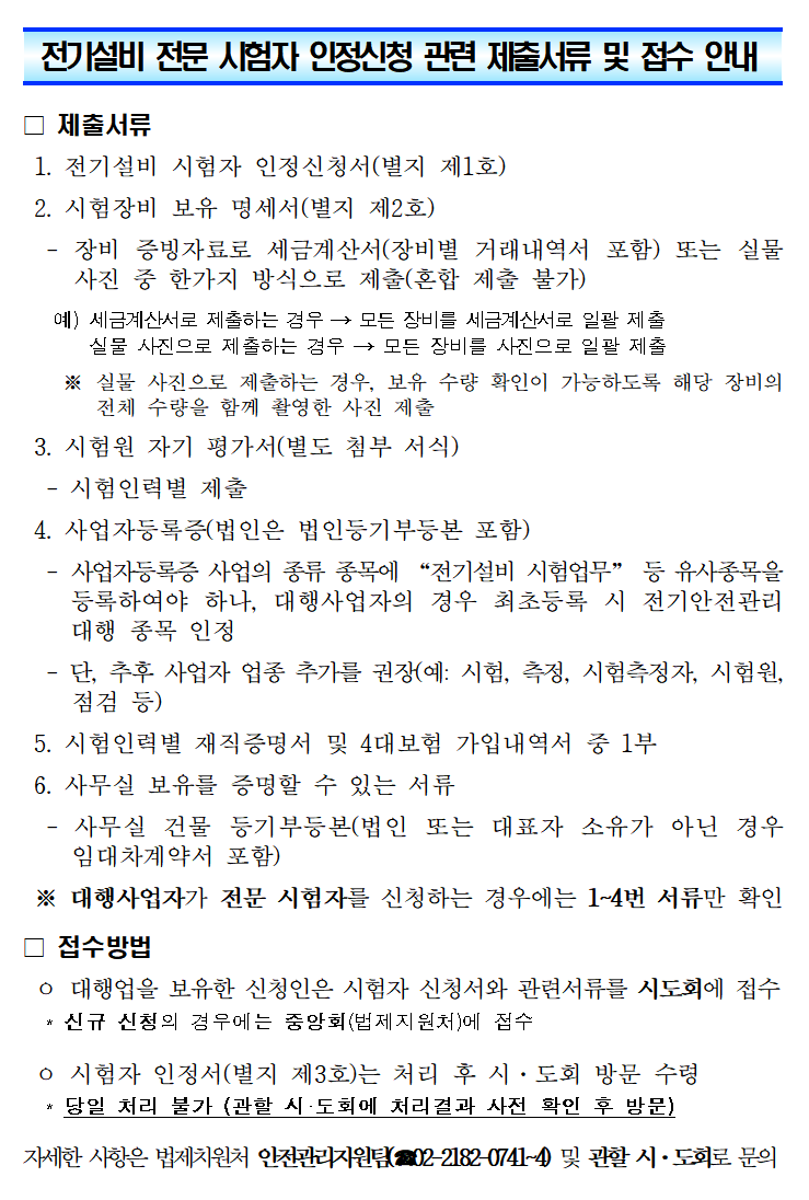 「전기설비 시험·측정자의 자격·장비 등의 세부기준」(한국전기안전공사 공고 제2025-2호)이 2026년 3월 1일자로 시행됨에 따라, 전문 시험자 인정신청과 관련한 제출서류 및 접수방법을 아래와 같이 안내드립니다.