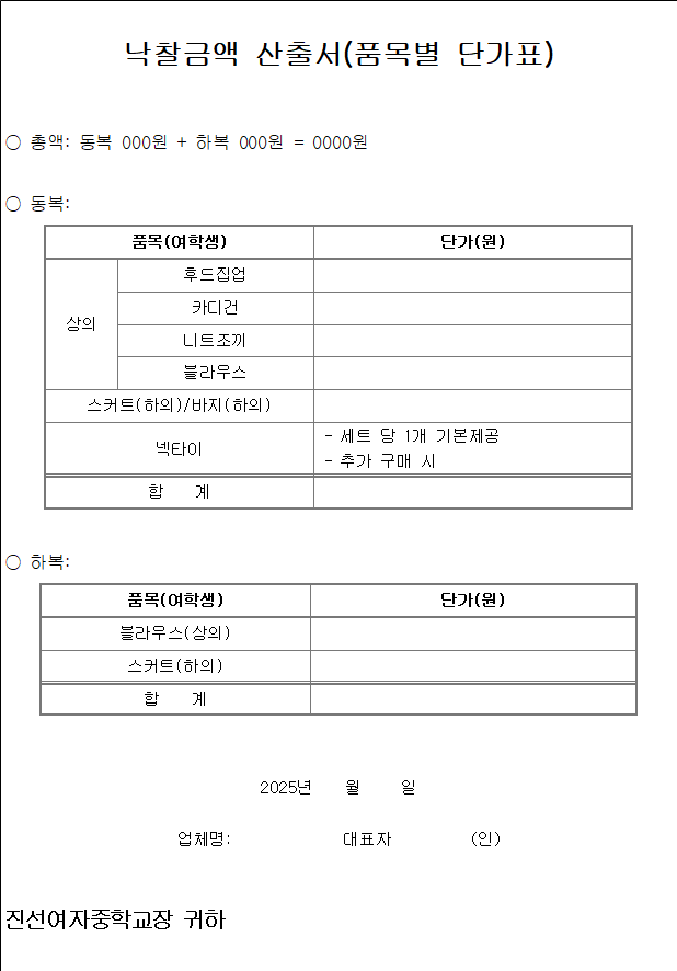 ○ 낙찰업체는 본교와 계약 시 교복 1벌의 낙찰금액 산출서(품목별 단가표)를 제시하여야 함
