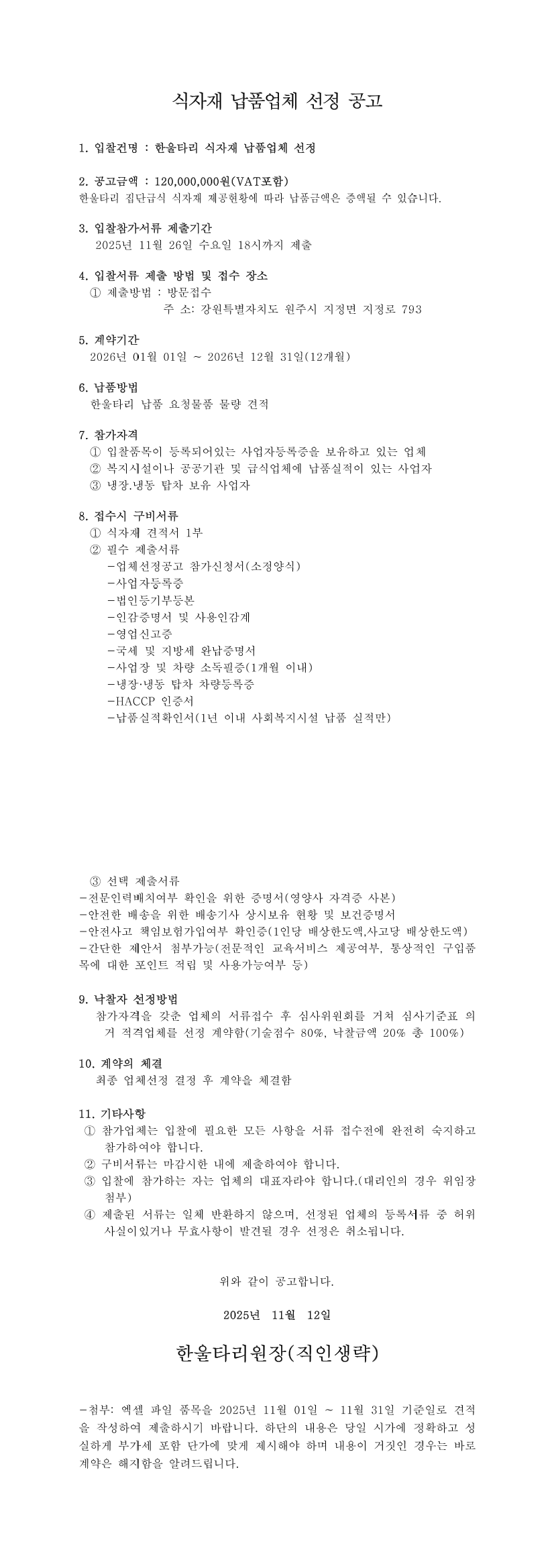 2026년 장애인거주시설 한울타리 식자재 납품 계약 |