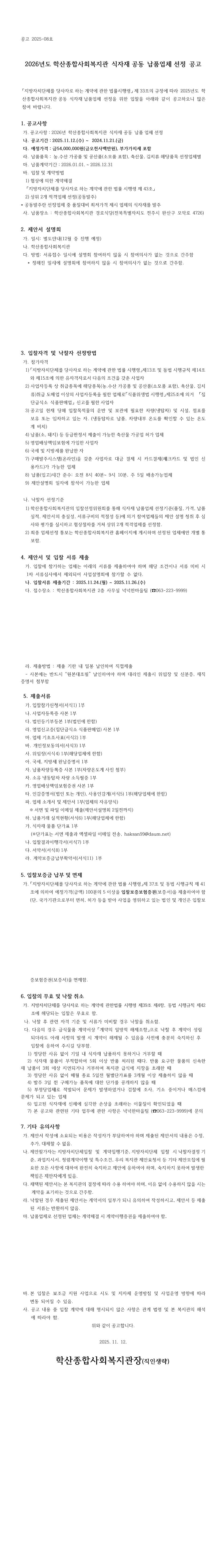 2026년 학산종합사회복지관 식자재입찰 공동납품업체 선정 공고 |