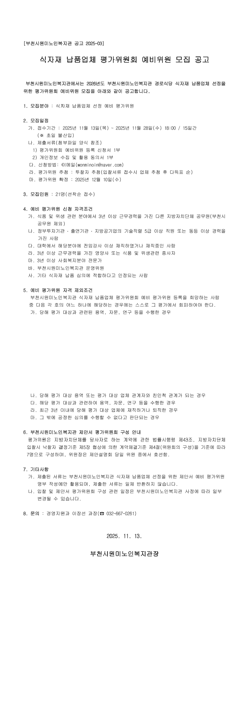 2026년도 부천시원미노인복지관 식자재 납품업체 입찰공고 |