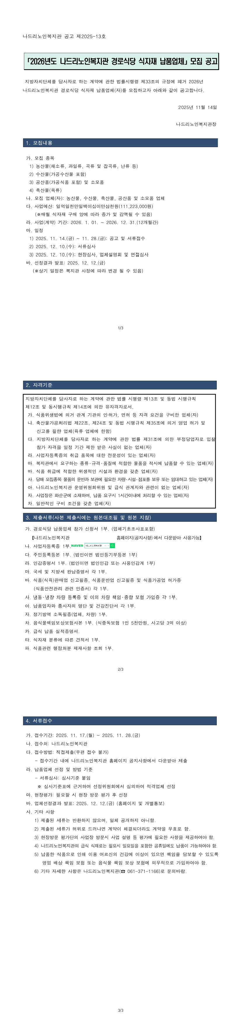 2026년 나드리노인복지관 경로식당 식자재 납품업체 모집 공고 |
