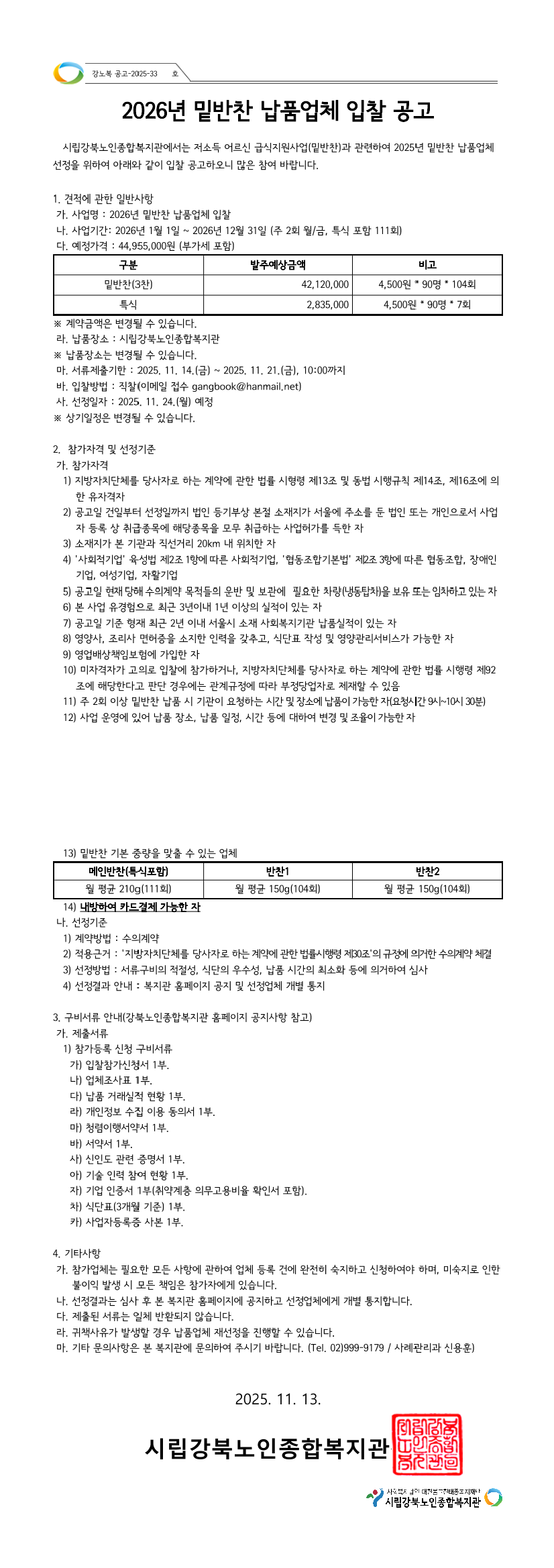 2026년 밑반찬 납품업체 선정공고 |