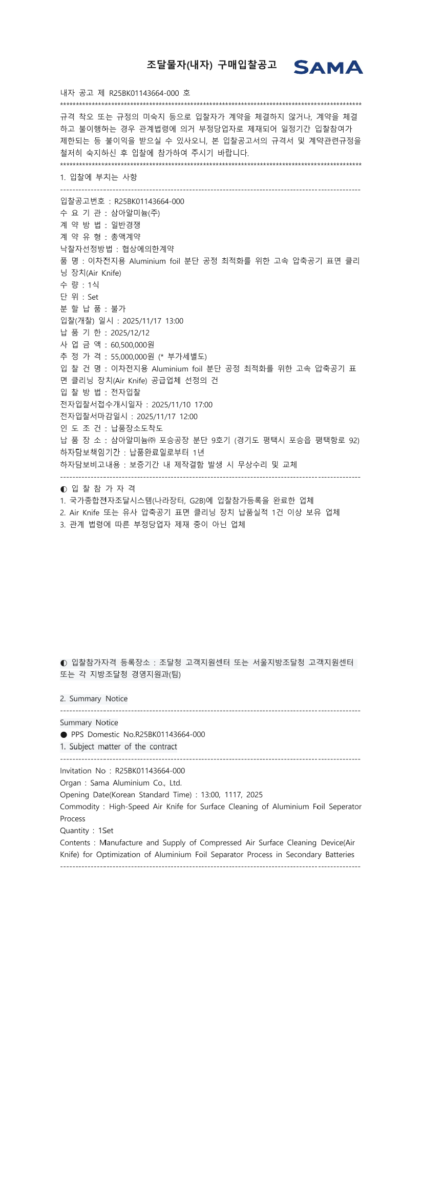 이차전지용 Aluminium foil 분단 공정 최적화를 위한 고속 압축공기 표면 클리닝 장치(Air Knife) 공급업체 선정의 건 |