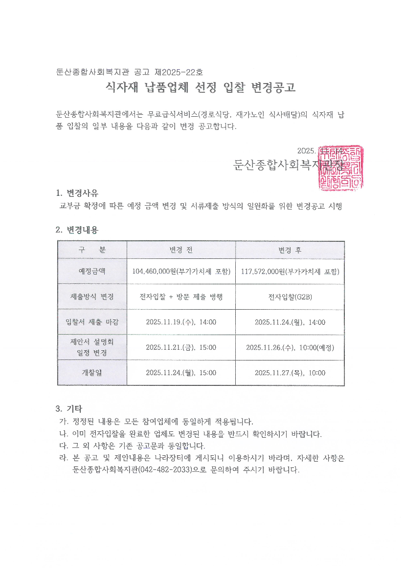 2026년 둔산종합사회복지관 무료급식서비스 식자재 납품업체 입찰공고 |