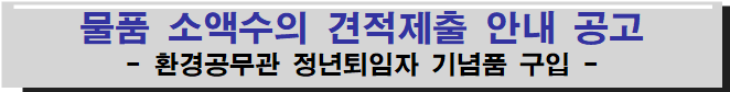 『환경공무관 정년퇴임자 기념품 구입』계약을 위하여「지방자치단체를 당사자로 하는 계약에 관한 법률」제10조 및 같은법 시행령 제30조, 『지방자치단체 입찰 및 계약집행기준』의 규정에 따라 소액수의 견적제출 공고를 안내합니다.