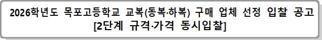 「지방자치단체를 당사자로 하는 계약에 관한 법률 시행령」(이하「지방계약법 시행령」이라 한다.) 제18조(2단계 경쟁 등의 입찰)의 규정에 따라 2026학년도 목포고등학교 교복(동·하복) 구매 업체 선정을 위한 입찰을 다음과 공고합니다.