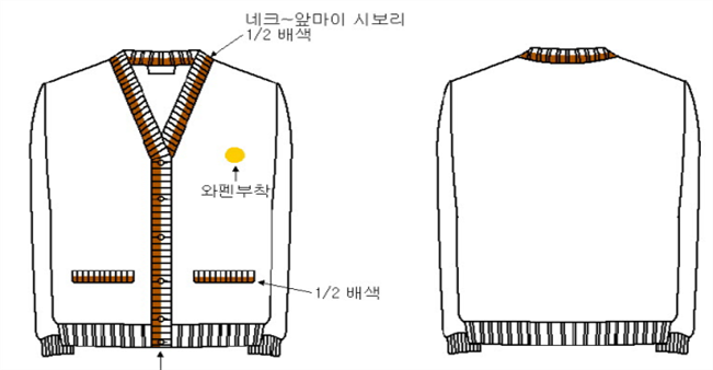 - 카라 끝 0.8cm 띄운후 청색 배색(0.8~1cm)