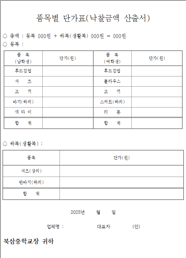 2026학년도 북삼중학교 학교주관교복(하복(생활복)·동복)구매
