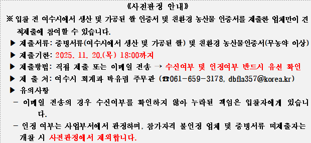 ※ 개찰 후 낙찰 예정자는 증빙서류(여수시에서 생산 및 가공된 쌀) 및 친환경 농산물인증서(무농약 이상)를 제출하여야 하며 미제출시 지방계약법 시행규칙 제42조(입찰무효)에 따라 낙찰자 선정에서 제외됩니다.