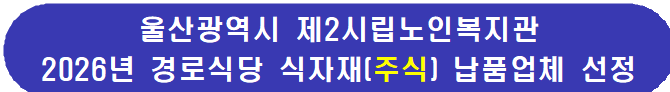 울산광역시 제2시립노인복지관에서는 경로식당 운영의 투명성과 효율성을 제고하고, 이용 어르신들로 하여금 양질의 식사를 제공하기 위하여 식자재(주식) 납품업체를 선정하고자 합니다. 2026년 식자재(주식) 납품업체를 아래와 같이 모집하오니 우수한 업체의 많은 참여 바랍니다.