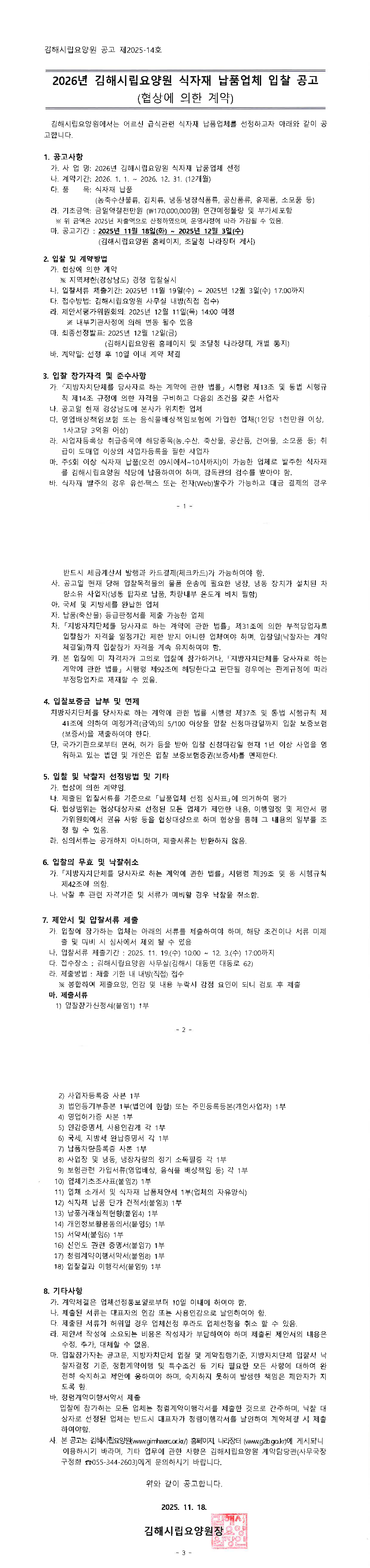 2026년 김해시립요양원 식자재 납품업체 입찰 공고 |