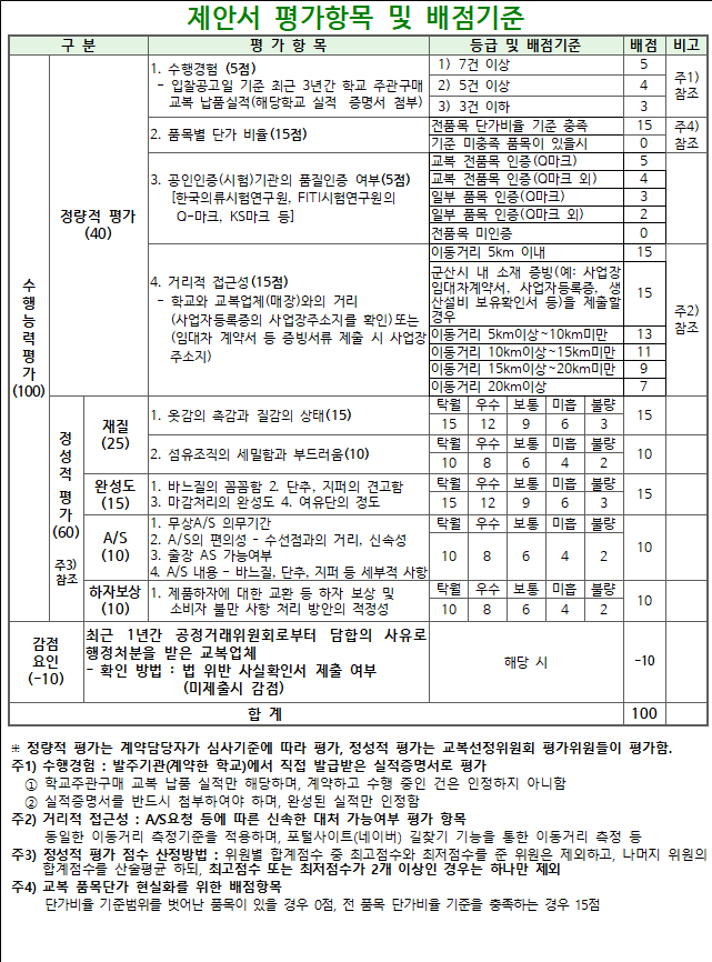 라. 제출서류 (블라인드 심사평가로 제안서, 교복 견본품에 업체명, 업체표시 문양 등을 제거하고 제출)