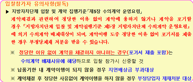 가. 지방자치단체를 당사자로 하는 계약에 관한 법률 시행령 제39조 및 동법 시행규칙 제42조,「지방자치단체 입찰 및 계약 집행기준」제11장 입찰유의서 규정에 의합니다.