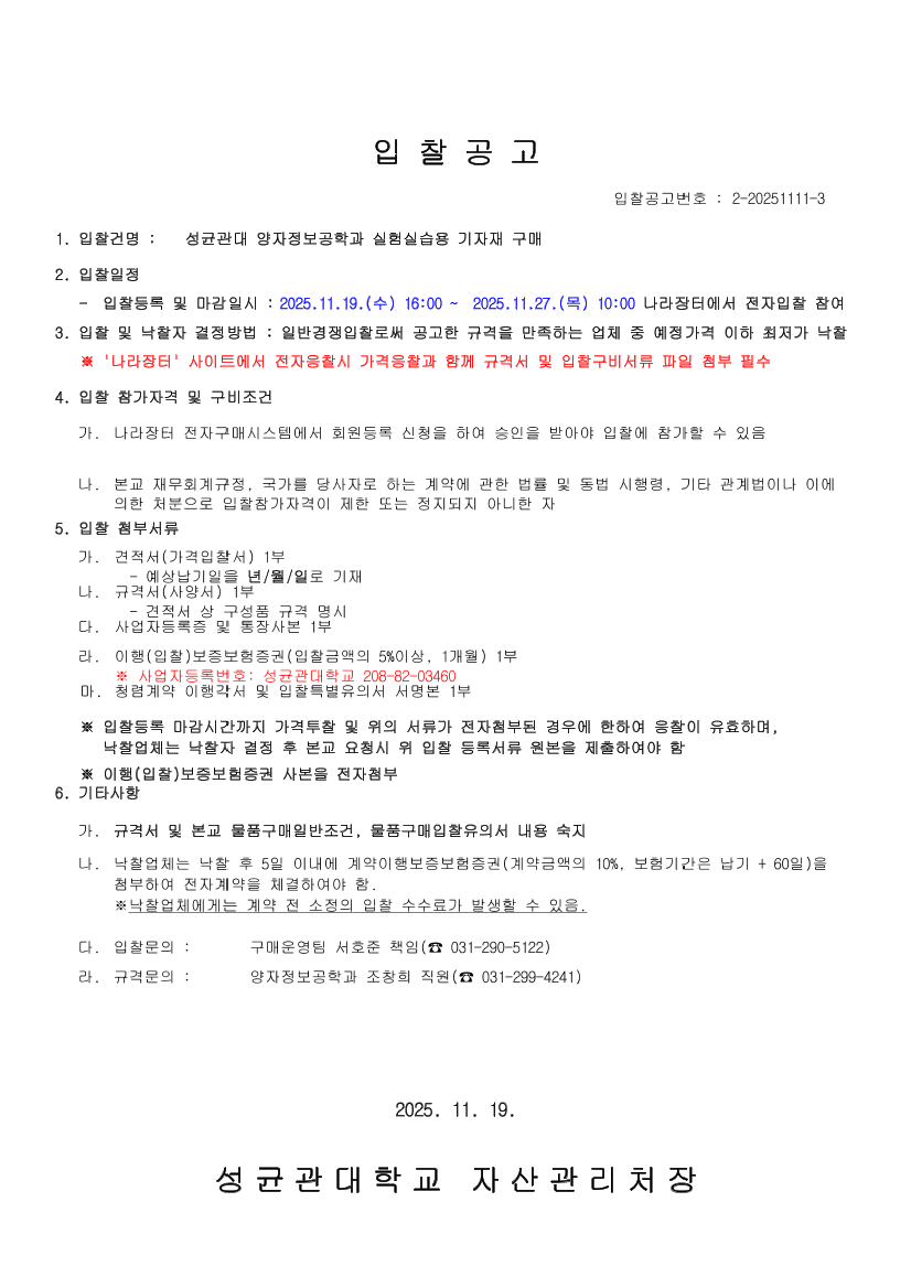 [성균관대(2-20251111-3)] 양자정보공학과 실험실습용 기자재 구매(대학혁신지원사업(2025)) |