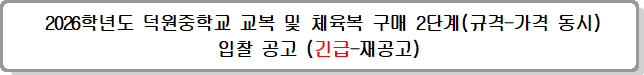 「지방자치단체를 당사자로 하는 계약에 관한 법률 시행령」제18조(2단계 입찰 규격-가격 동시입찰)규정에 의거 2026학년도 덕원중학교 교복 및 체육복 학교주관 구매 업체 선정을 위해 다음과 같이 물품구매를 시행하고자 하오니 계약을 원하는 업체는 아래 사항과 ‘지방자치단체를 당사자로 하는 계약에 관한 법률’, 동법 시행령 및 시행규칙, 관련 회계예규, 입찰유의서, 물품계약일반조건, 청렴계약을 위한 입찰 특별 유의서 및 특수조건 및 본 공고문을 완전히 숙지하신 후 이에 따라 입찰에 참가하여 주시기 바랍니다.
