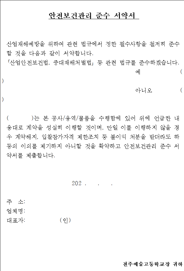 나. 본 견적(입찰)에 참가하고자 하는 자는 중대재해 예방을 위한 안전 및 보건 확보 의무사항을 숙지하신 후 견적(입찰)에 응하여야 하며, 계약 체결 시에 【붙임 1】「안전보건관리 준수 서약서」, 【붙임 2】「안전보건관리계획서」, 【붙임 3】「청렴계약 이행서약서」를 제출하여야 합니다.
