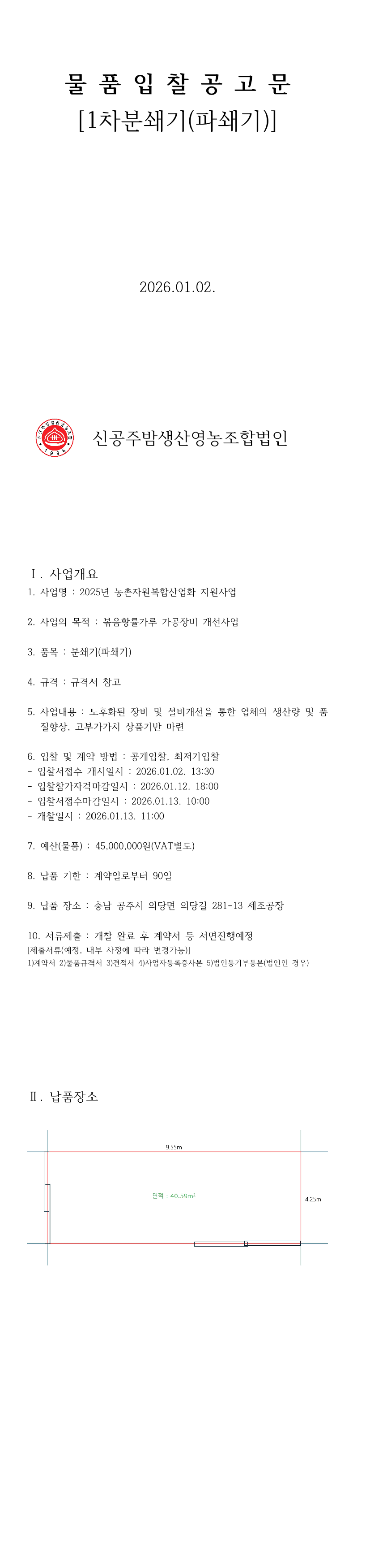 2025년 농촌자원복합산업화 지원사업[볶음황률가루 가공장비개선사업]-분쇄(파쇄기) 구매공고 |