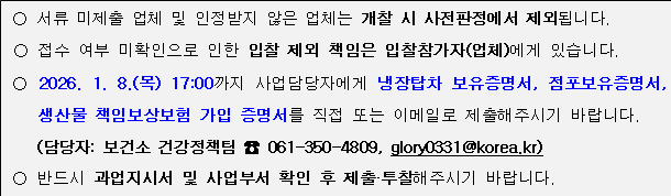 사. 본 입찰의 과업에 관한 세부사항은 우리군 보건소(☏061-350-4809)로, 입찰에 관한 사항은 재무과(☏061-350-5273)로 문의하시기 바랍니다.