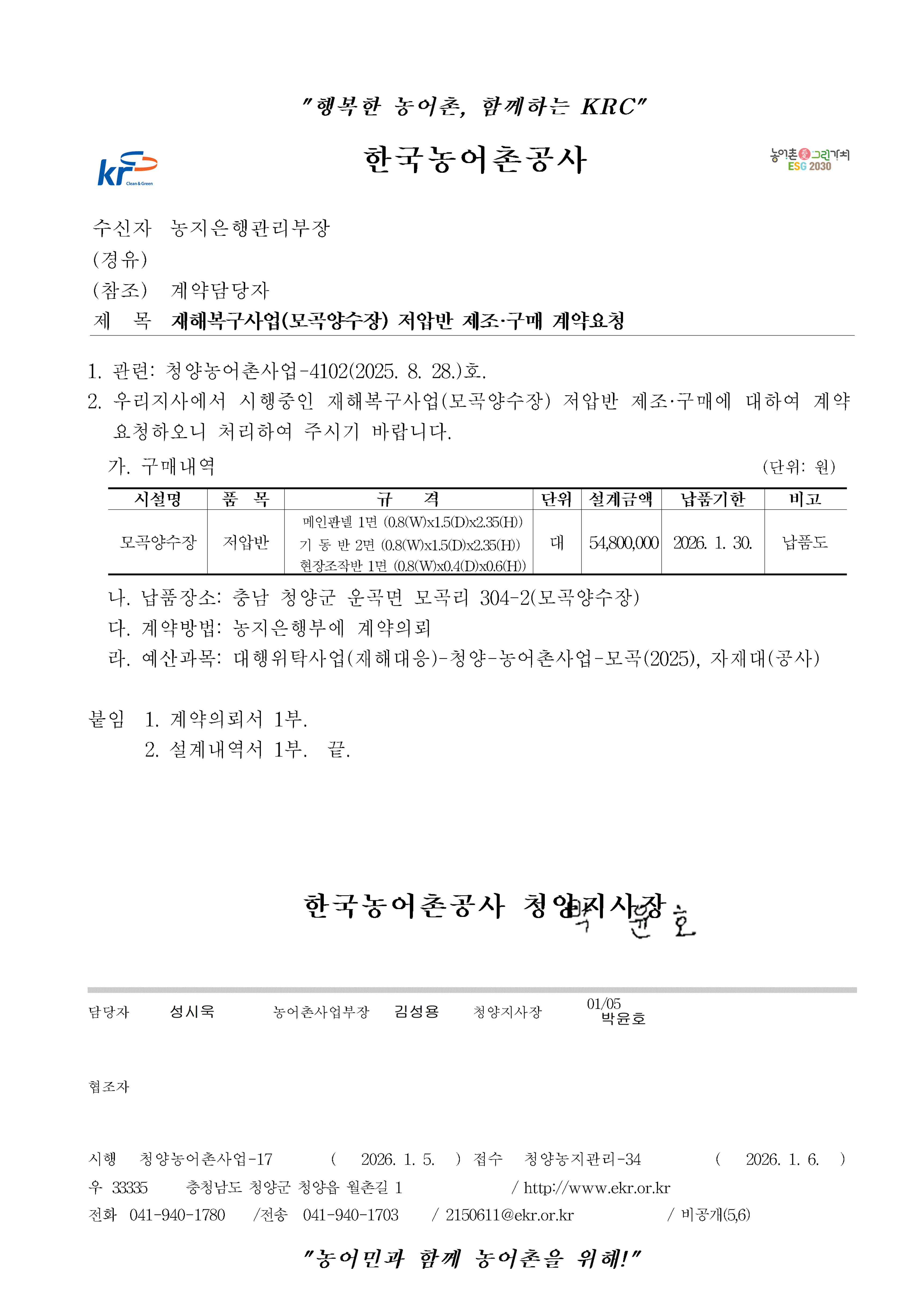 재해복구사업(모곡양수장) 저압반 제조 구매 계약 |
