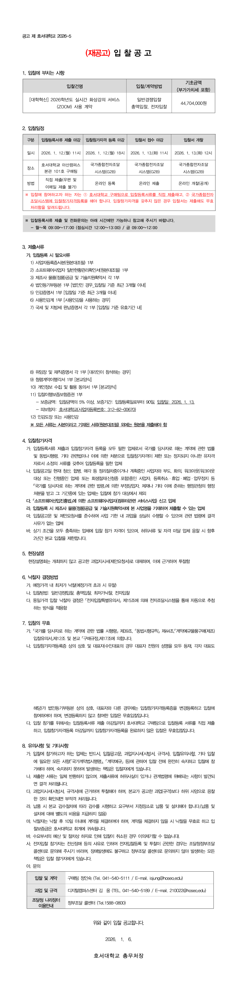 (재공고) [대학혁신] 2026학년도 실시간 화상강의 서비스(ZOOM) 사용 계약 |