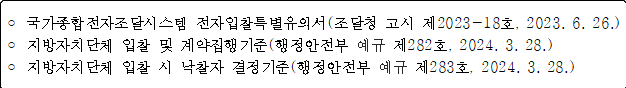 - 입찰에참가하고자하는자는「지방계약법 시행령」등의 입찰 관련 법령을 입찰 전에 완전히 숙지하여야 하며, 이를 숙지하지 못한 책임은 입찰자에게 있습니다.