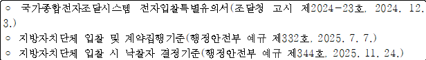 - 입찰에참가하고자하는자는「지방계약법 시행령」등의 입찰 관련 법령을 입찰전에 완전히 숙지하여야 하며, 이를 숙지하지 못한 책임은 입찰자에게 있습니다.