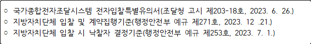 - 입찰에참가하고자하는자는「지방계약법 시행령」등의 입찰 관련 법령을 입찰전에 완전히 숙지하여야 하며, 이를 숙지하지 못한 책임은 입찰자에게 있습니다.