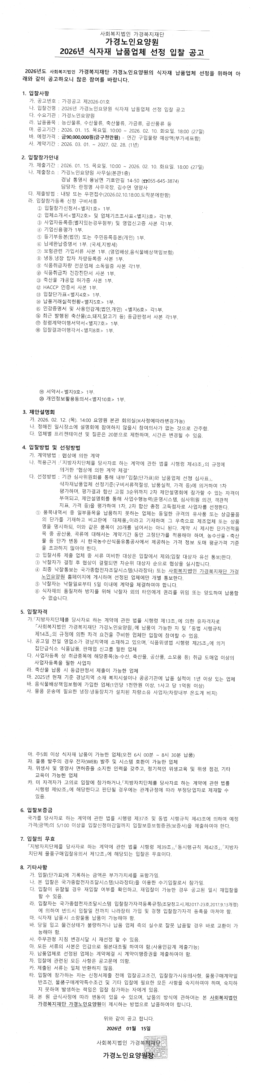 2026년 가경노인요양원 식자재 납품업체 선정 |