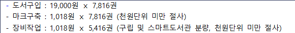 - 도서구입비 148,004천원(구립도서관 85,120천원, 작은도서관 45,600천원, 스마트도서관 17,784천원)