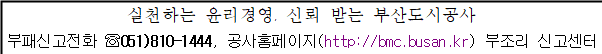 ○ 부조리신고센터(익명․실명 신고가능) : 부산도시공사 홈페이지(https://www.bmc.busan.kr)