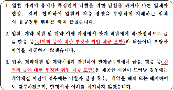 가. 본 입찰에 참여한 자는 모두 청렴계약입찰특별유의서 제2조 제1항에 따라 청렴계약 이행각서를 제출한 것으로 간주합니다. 최종 낙찰자로 선정된 업체는 계약체결 시 청렴서약서를 반드시 제출하여야 합니다.