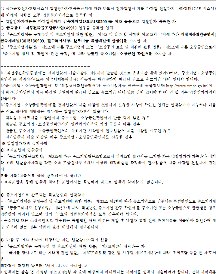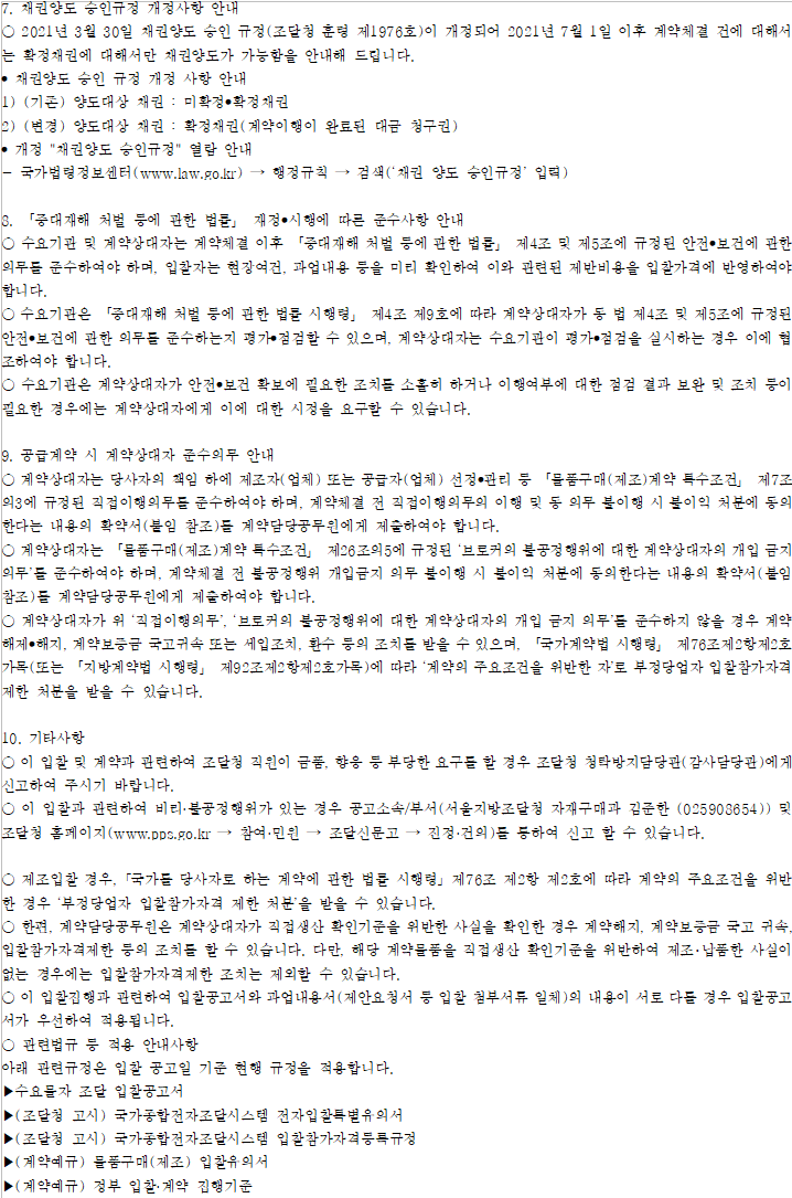 - 이 입찰 공고 건은 「국가를 당사자로 하는 계약에 관한 법률 시행령」 제73조와 「(계약예규) 정부 입찰