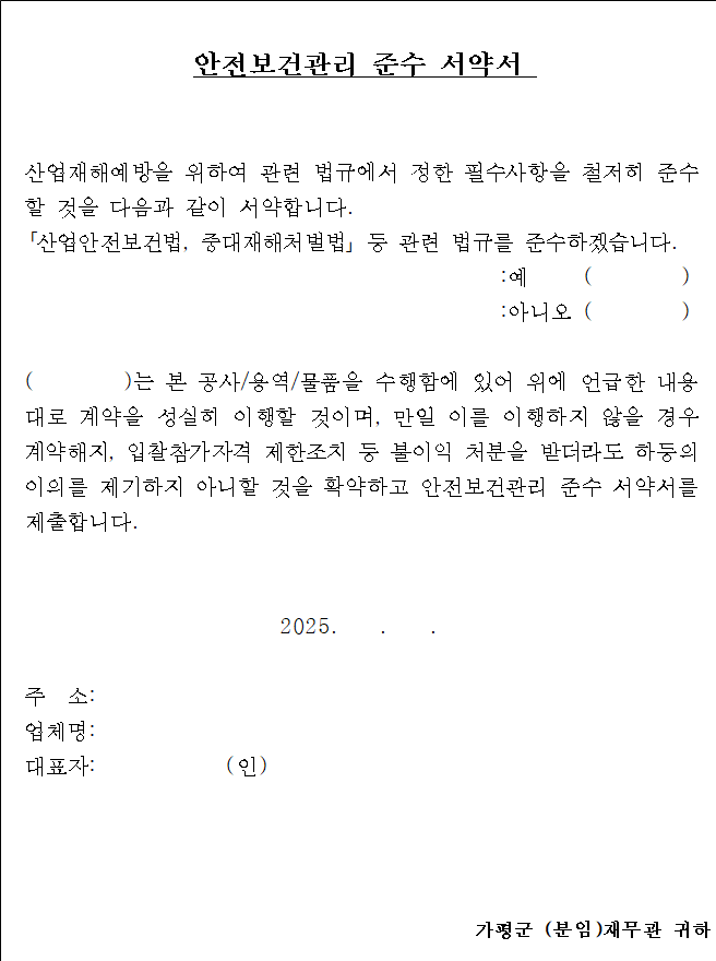 나. 본 입찰에 참가하고자 하는 자는 중대 재해 예방을 위한 안전 및 보건 확보 의무사항을 숙지하신 후 입찰에 응하여야 하며, 계약체결 시에 「안전보건관리 준수 서약서」를 제출하여야 합니다.
