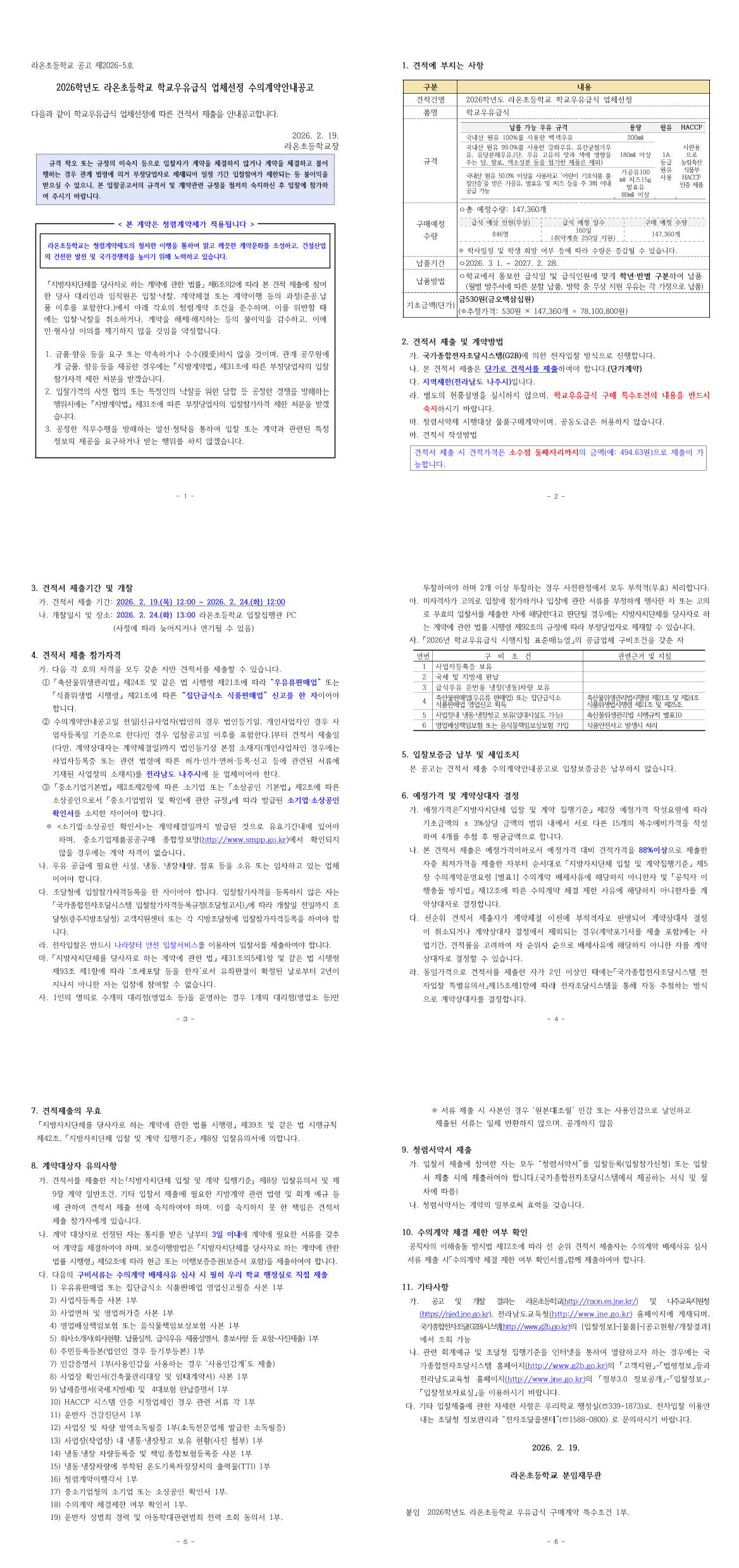 2026학년도 라온초등학교 학교우유급식 업체선정 수의계약안내공고 |
